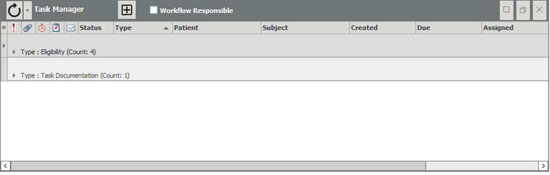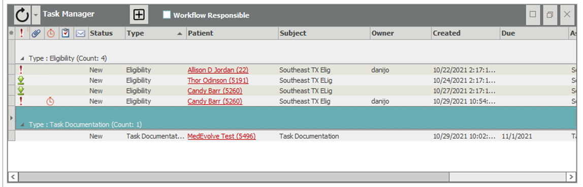 - The tasks will be grouped by their type. Users can then click on the black arrow beside the type and all tasks in that group will then display. Users can sort or filter the columns inside of the Task Manager MedMat. If the client is set up for Tasks in Workflow that are set up to flow back and forward between the systems, you can also check Workflow Responsible to see what tasks are currently assigned in the Workflow application.