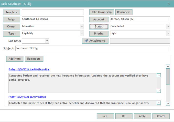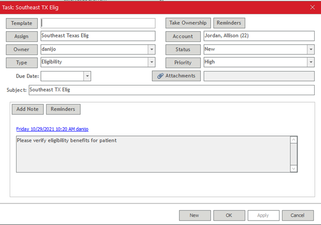 - In this example the task is to verify eligibility for the patient. The user will then work the task and add a note showing what was done. If it requires another team to assist they can then assign the task to the next group or user and apply.