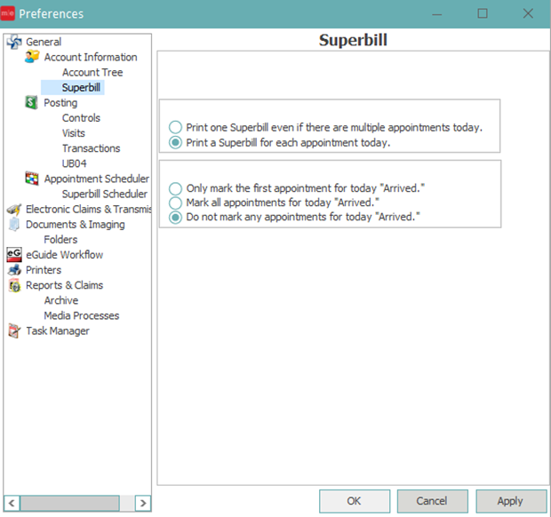 - Multiple Appointments Printing o Print one Superbill even if there are multiple appointments today - Select this option if you only want to print one superbill even if there are multiple appointments scheduled for the day.
