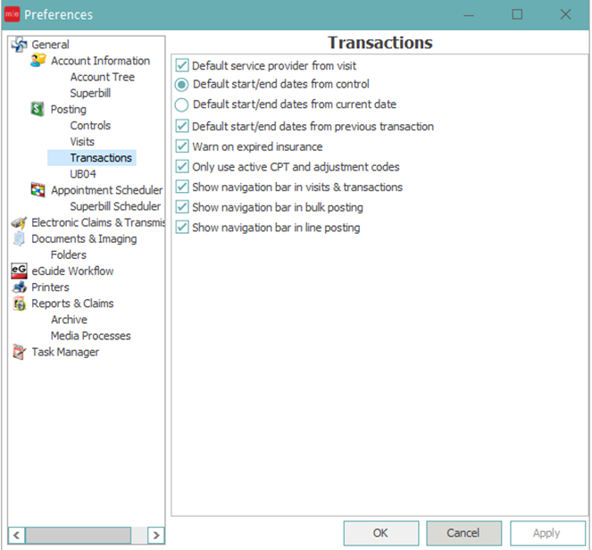 - Default start/end date from previous transaction - If selected the transaction start/end date will default from previous transaction posted